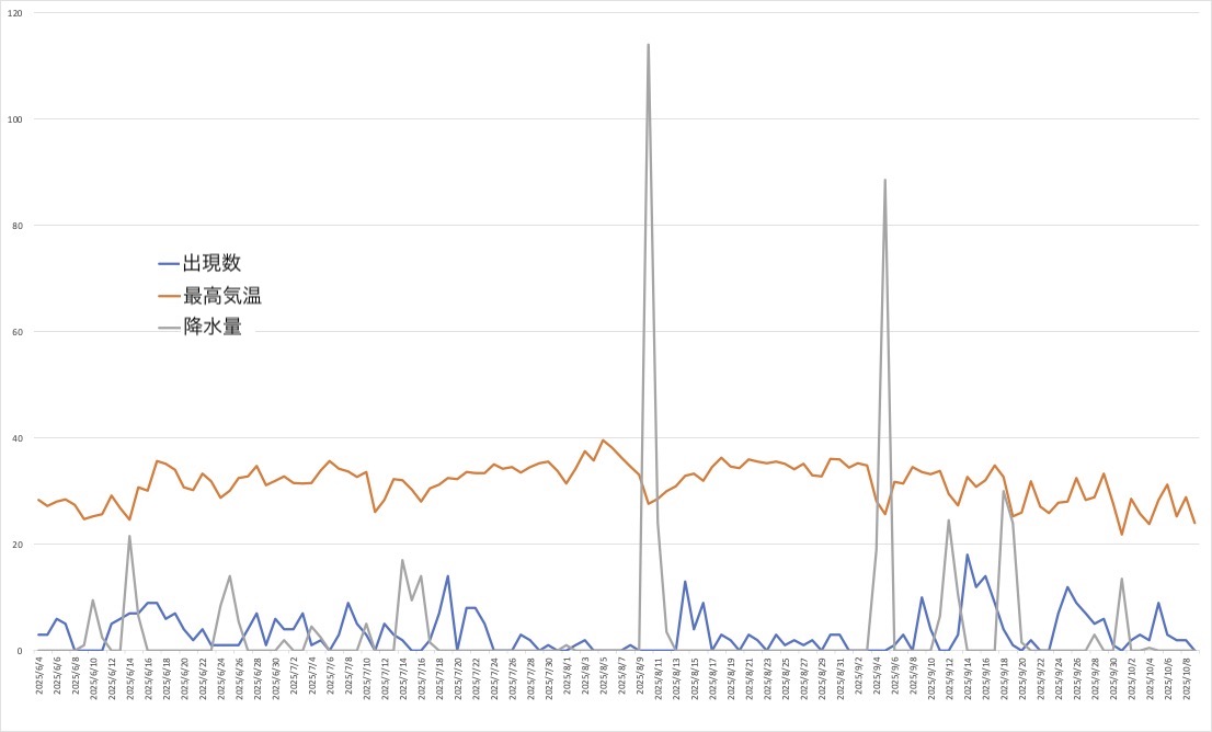 いずれの粘菌も7月25日以降8月末まで出現が抑えられる傾向があります。図1に粘菌の総出現数、最高気温、降水量の経日変化を示しました。8月10日から3日間雨が降った後、一時的に出現が見られることから、出現数の減少は高温のためというよりは、降水量が少なくなったためと考えられます。ススホコリが他に比べて出現数が多いのは、乾燥に強いからということも考えられます。他の粘菌がほぼ見られなくなった8月下旬でもススホコリは毎日出現しています。10月に入ってもススホコリ属やツノホコリ属は出現しましたが、10月10日以降見られなくなりました。